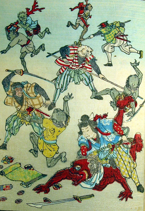 grew up as the village strong man. When he heard that some oni (demons) in Onigashima island were tormenting the villages, Momotarō decided to get rid of them. His parents worried because the oni was described as human-like, very strong, with thick red skin, sharp teeth and claws, horns, and a kanabo—a club with which it could inflict great harm.