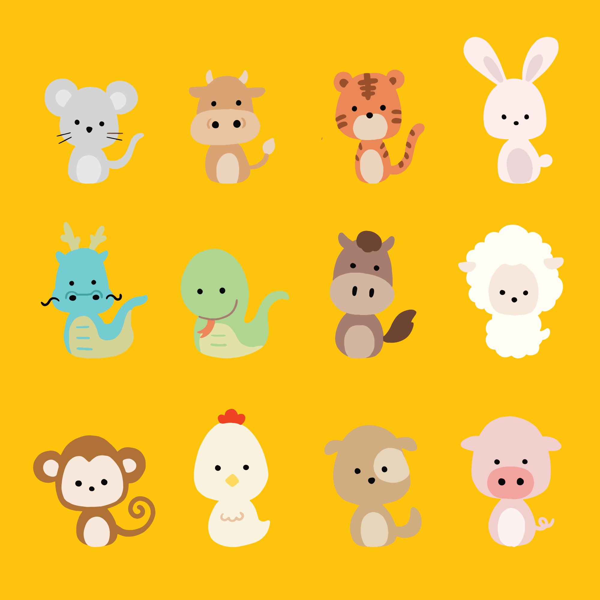 The animals on the Chinese zodiac include rat, ox, tiger, rabbit, dragon, snake, horse, goat, monkey, rooster, dog, and pig. The Japanese zodiac replaced the goat for the sheep (hitsuji) and the pig for the Wild boar (inoshishi).