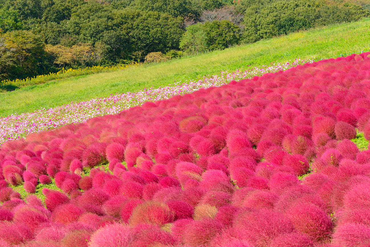 Hitachi National Seaside Park in Ibaraki Prefecture, easily accessible via a direct highway bus from Tokyo Station as well as by train, presents an excellent choice. Renowned for its expansive floral displays, this park features hills adorned with striking Kokia bushes that transition from vibrant green in the summer to fiery red in the autumn. Amidst fields of pink and white cosmos flowers and autumnal foliage, the park hosts a Kokia Carnival in October, offering delectable fall gourmet treats.